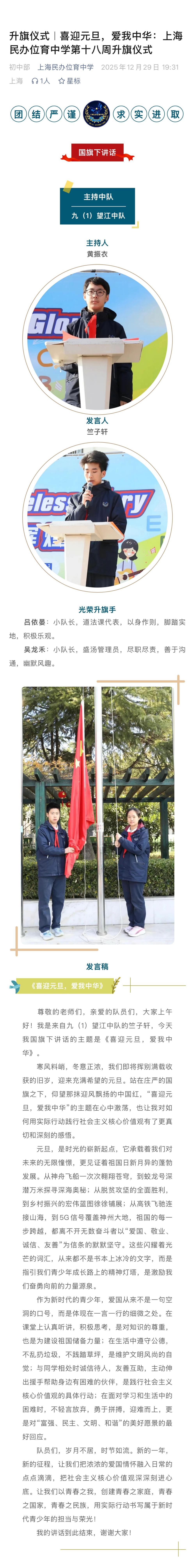 升旗仪式|喜迎元旦,爱我中华:上海民办位育中学第十八周升旗仪式