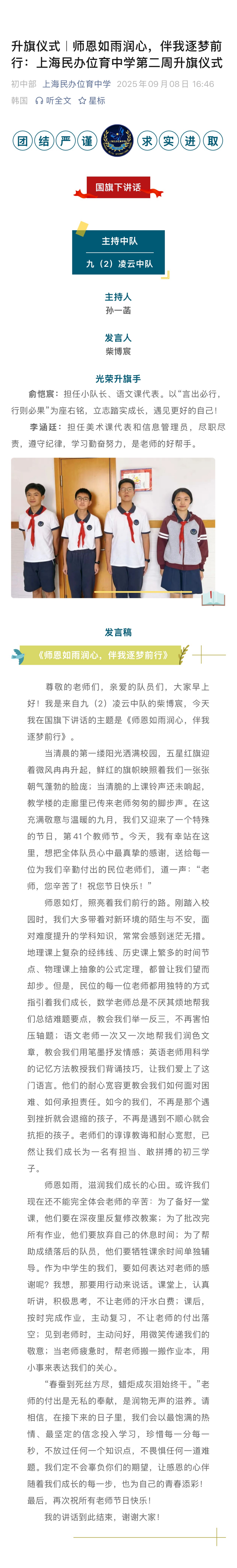 升旗仪式|师恩如雨润心,伴我逐梦前行:上海民办位育中学第二周升旗仪式