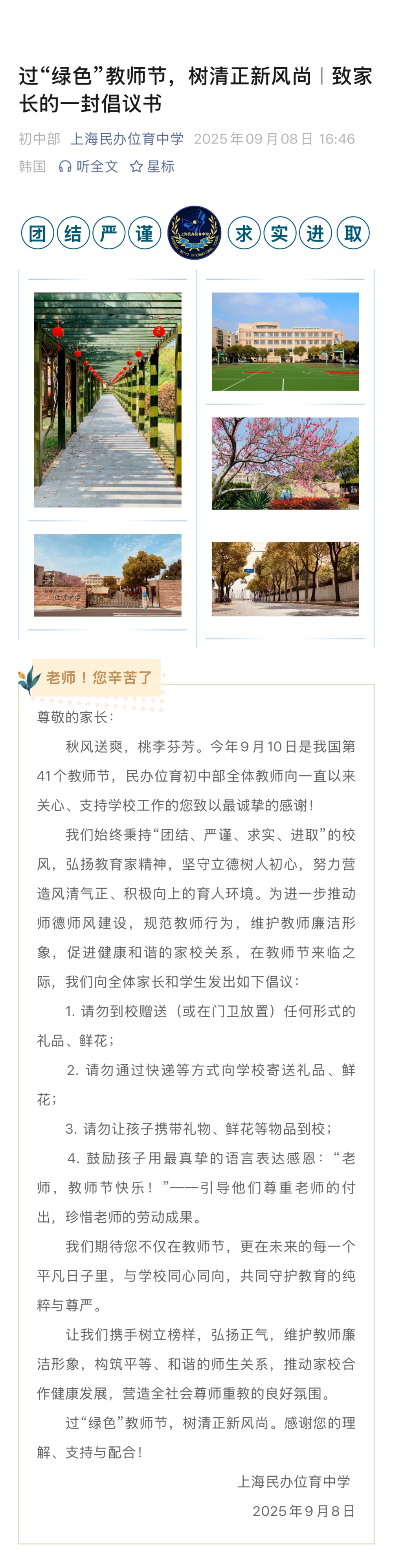 过“绿色”教师节,树清正新风尚|致家长的一封倡议书