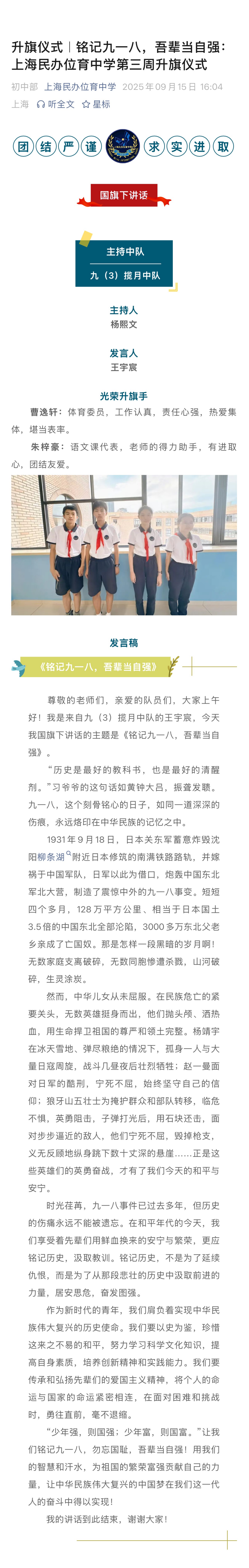 升旗仪式|铭记九一八,吾辈当自强:上海民办位育中学第三周升旗仪式