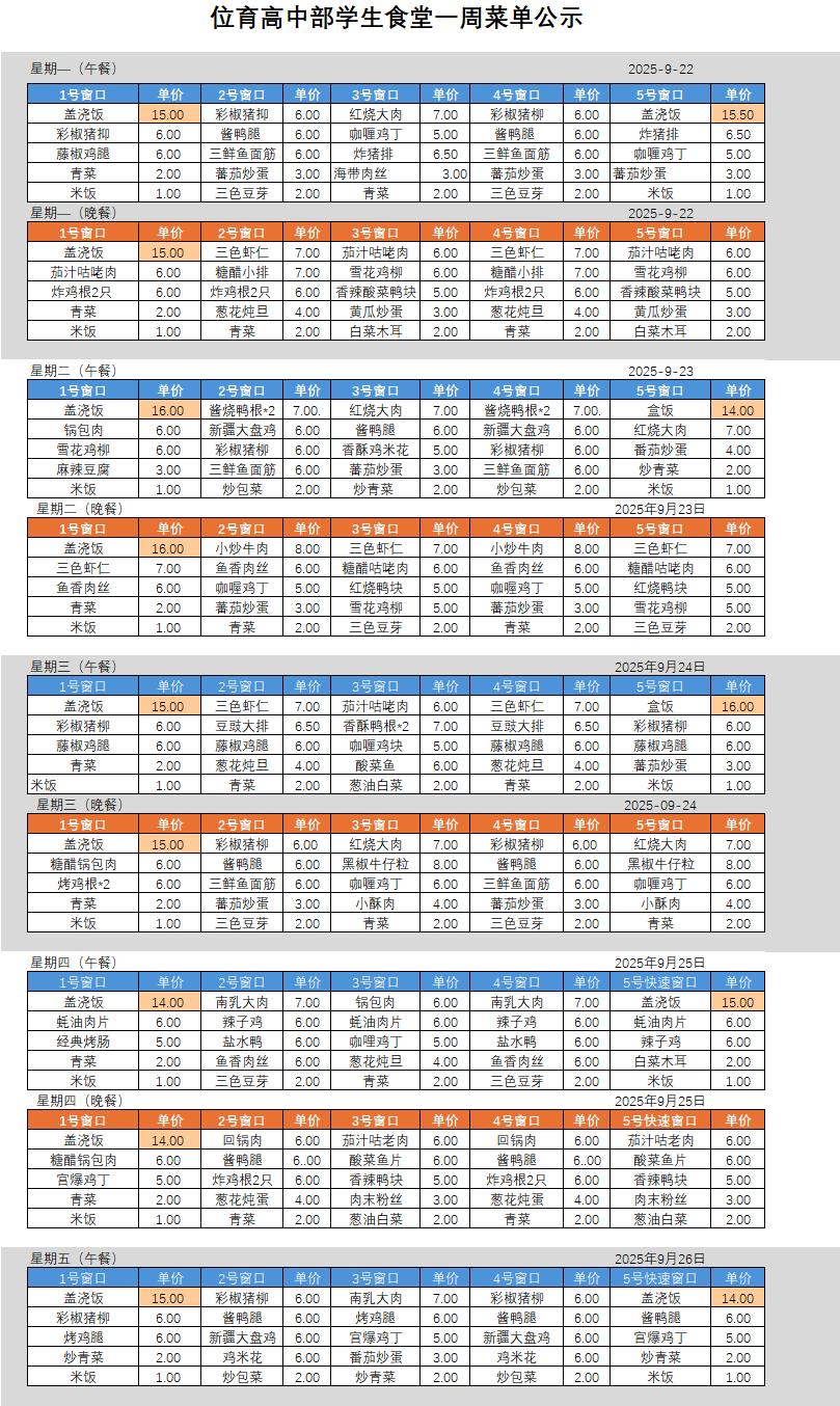 高中部菜单公示(2025.9.22-9.26)