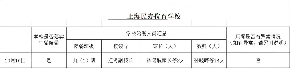 上海民办位育中学(初中部)2025年10月10日午餐陪餐公示