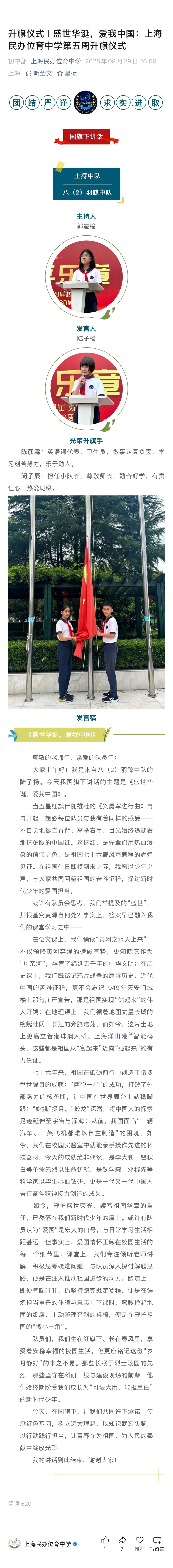 升旗仪式|盛世华诞,爱我中国:上海民办位育中学第五周升旗仪式