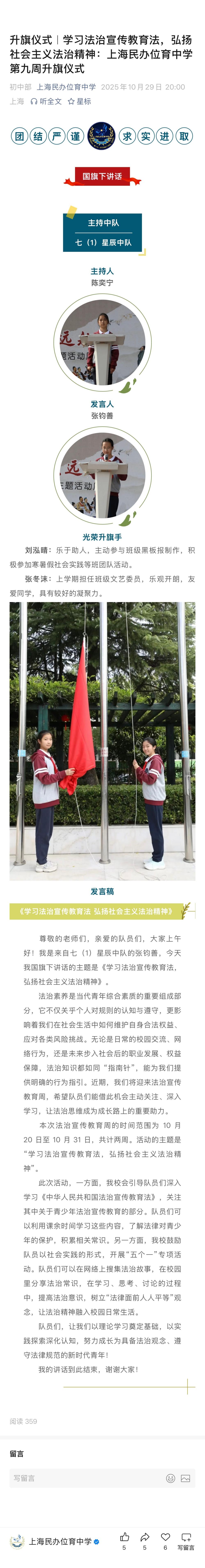 升旗仪式|学习法治宣传教育法,弘扬社会主义法治精神:上海民办位育中学第九周升旗仪式