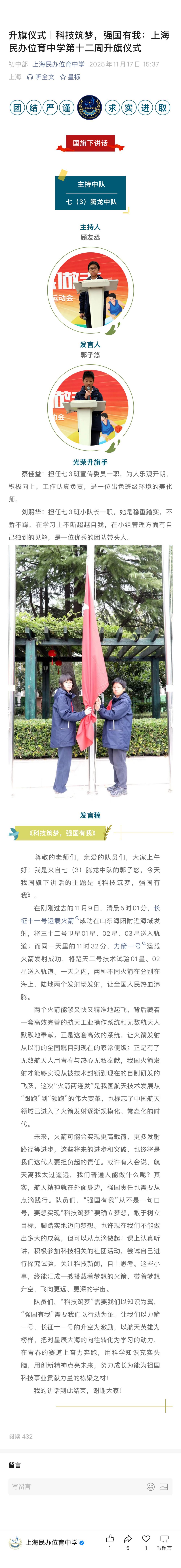 升旗仪式|科技筑梦,强国有我:上海民办位育中学第十二周升旗仪式