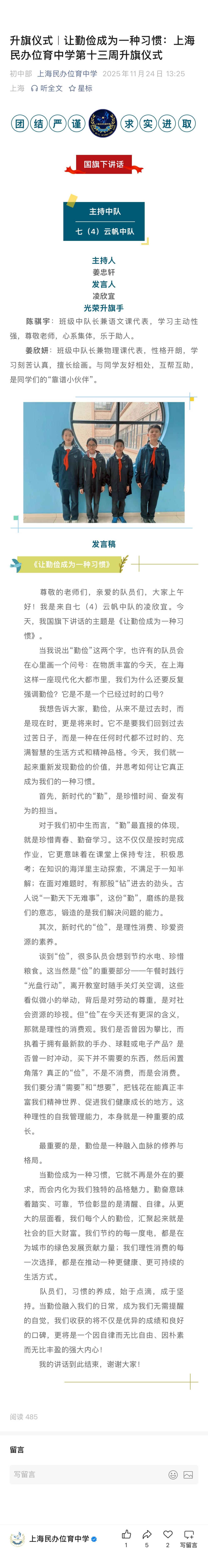 升旗仪式|让勤俭成为一种习惯:上海民办位育中学第十三周升旗仪式