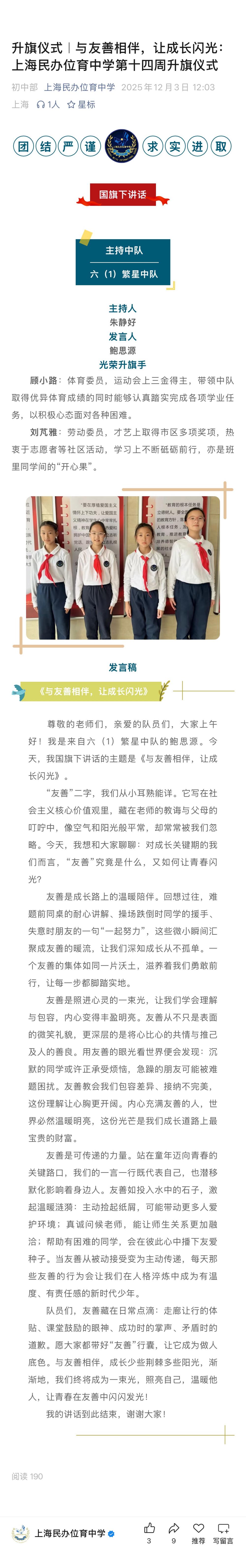 升旗仪式|与友善相伴,让成长闪光:上海民办位育中学第十四周升旗仪式