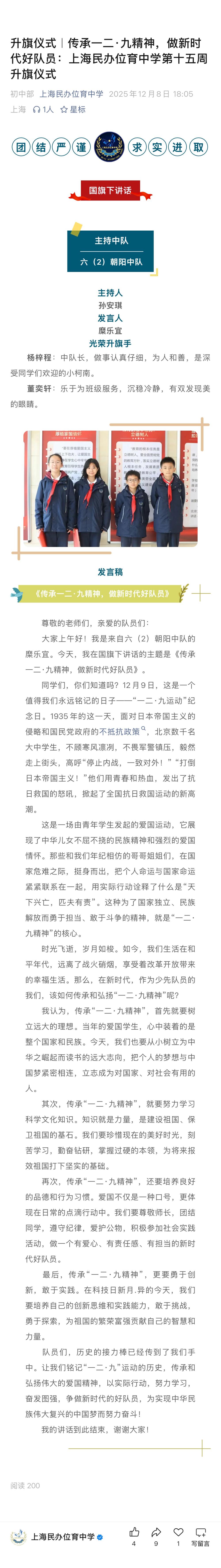 升旗仪式|传承一二·九精神,做新时代好队员:上海民办位育中学第十五周升旗仪式